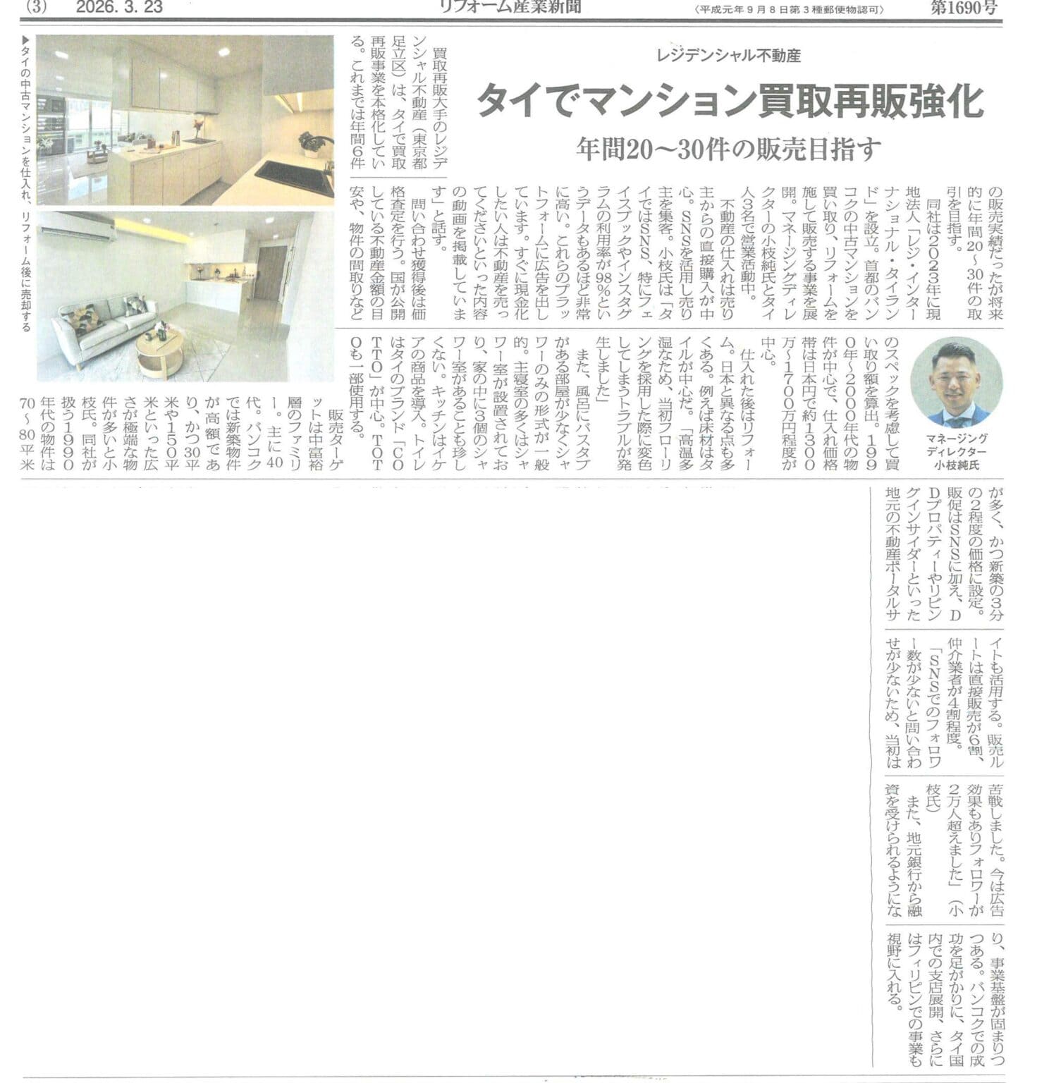 レジデンシャル不動産のグループ会社である「現地法人 レジインターナショナルタイランド」の取り組みについて大きく取り上げていただき、記事内では、タイにおけるマンション買取再販事業の強化をはじめ、今後の販売目標、さらには現地のニーズに合わせたリノベーション戦略など、幅広い取り組みや今後の展望について紹介されています。